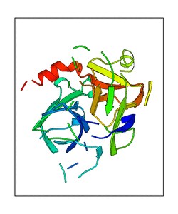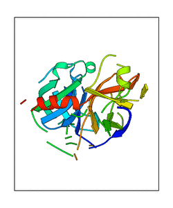 These views are prepared from three orthologuous viewpoints with MolScript. Secondary structures are determined from the C-alpha atom positions of your protein (N-terminal blue, C-terminal red).