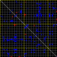 This matrix displays the maximum distance fluctuations between all pairs of CA atoms and between the two extreme conformations that were computed for this mode (DQMIN/DQMAX). Distance increases are plotted in blue and decreases in red for the strongest 10% of the residue pair distance changes. Every pixel corresponds to a single residue. Grey lines are drawn every 10 residues, yellow lines every 100 residues (counting from the upper left corner).