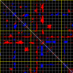 This matrix displays the maximum distance fluctuations between all pairs of CA atoms and between the two extreme conformations that were computed for this mode (DQMIN/DQMAX). Distance increases are plotted in blue and decreases in red for the strongest 10% of the residue pair distance changes. Every pixel corresponds to a single residue. Grey lines are drawn every 10 residues, yellow lines every 100 residues (counting from the upper left corner).