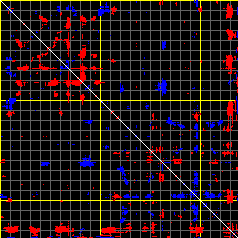 This matrix displays the maximum distance fluctuations between all pairs of CA atoms and between the two extreme conformations that were computed for this mode (DQMIN/DQMAX). Distance increases are plotted in blue and decreases in red for the strongest 10% of the residue pair distance changes. Every pixel corresponds to a single residue. Grey lines are drawn every 10 residues, yellow lines every 100 residues (counting from the upper left corner).