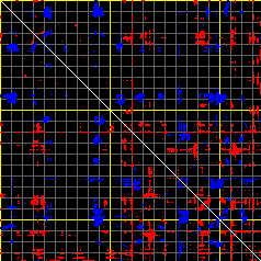 This matrix displays the maximum distance fluctuations between all pairs of CA atoms and between the two extreme conformations that were computed for this mode (DQMIN/DQMAX). Distance increases are plotted in blue and decreases in red for the strongest 10% of the residue pair distance changes. Every pixel corresponds to a single residue. Grey lines are drawn every 10 residues, yellow lines every 100 residues (counting from the upper left corner).
