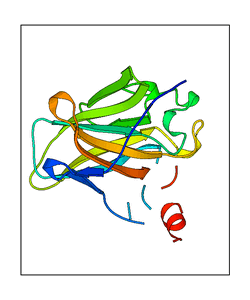 These views are prepared from three orthologuous viewpoints with MolScript. Secondary structures are determined from the C-alpha atom positions of your protein (N-terminal blue, C-terminal red).