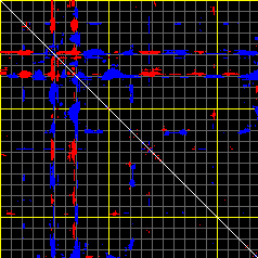 This matrix displays the maximum distance fluctuations between all pairs of CA atoms and between the two extreme conformations that were computed for this mode (DQMIN/DQMAX). Distance increases are plotted in blue and decreases in red for the strongest 10% of the residue pair distance changes. Every pixel corresponds to a single residue. Grey lines are drawn every 10 residues, yellow lines every 100 residues (counting from the upper left corner).