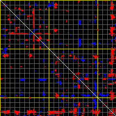 This matrix displays the maximum distance fluctuations between all pairs of CA atoms and between the two extreme conformations that were computed for this mode (DQMIN/DQMAX). Distance increases are plotted in blue and decreases in red for the strongest 10% of the residue pair distance changes. Every pixel corresponds to a single residue. Grey lines are drawn every 10 residues, yellow lines every 100 residues (counting from the upper left corner).