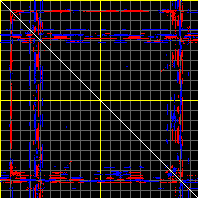 This matrix displays the maximum distance fluctuations between all pairs of CA atoms and between the two extreme conformations that were computed for this mode (DQMIN/DQMAX). Distance increases are plotted in blue and decreases in red for the strongest 10% of the residue pair distance changes. Every pixel corresponds to a single residue. Grey lines are drawn every 10 residues, yellow lines every 100 residues (counting from the upper left corner).