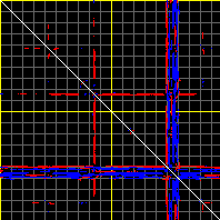 This matrix displays the maximum distance fluctuations between all pairs of CA atoms and between the two extreme conformations that were computed for this mode (DQMIN/DQMAX). Distance increases are plotted in blue and decreases in red for the strongest 10% of the residue pair distance changes. Every pixel corresponds to a single residue. Grey lines are drawn every 10 residues, yellow lines every 100 residues (counting from the upper left corner).