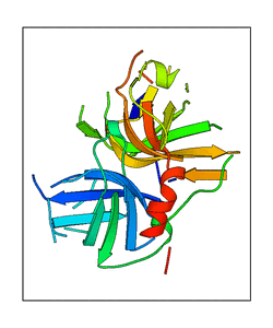These views are prepared from three orthologuous viewpoints with MolScript. Secondary structures are determined from the C-alpha atom positions of your protein (N-terminal blue, C-terminal red).