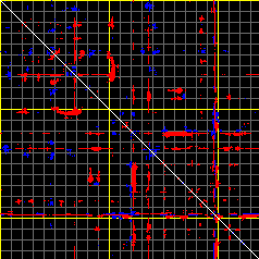 This matrix displays the maximum distance fluctuations between all pairs of CA atoms and between the two extreme conformations that were computed for this mode (DQMIN/DQMAX). Distance increases are plotted in blue and decreases in red for the strongest 10% of the residue pair distance changes. Every pixel corresponds to a single residue. Grey lines are drawn every 10 residues, yellow lines every 100 residues (counting from the upper left corner).