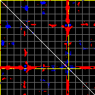 This matrix displays the maximum distance fluctuations between all pairs of CA atoms and between the two extreme conformations that were computed for this mode (DQMIN/DQMAX). Distance increases are plotted in blue and decreases in red for the strongest 10% of the residue pair distance changes. Every pixel corresponds to a single residue. Grey lines are drawn every 10 residues, yellow lines every 100 residues (counting from the upper left corner).