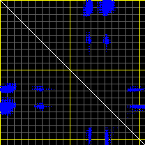 This matrix displays the maximum distance fluctuations between all pairs of CA atoms and between the two extreme conformations that were computed for this mode (DQMIN/DQMAX). Distance increases are plotted in blue and decreases in red for the strongest 10% of the residue pair distance changes. Every pixel corresponds to a single residue. Grey lines are drawn every 10 residues, yellow lines every 100 residues (counting from the upper left corner).