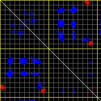 This matrix displays the maximum distance fluctuations between all pairs of CA atoms and between the two extreme conformations that were computed for this mode (DQMIN/DQMAX). Distance increases are plotted in blue and decreases in red for the strongest 10% of the residue pair distance changes. Every pixel corresponds to a single residue. Grey lines are drawn every 10 residues, yellow lines every 100 residues (counting from the upper left corner).