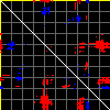This matrix displays the maximum distance fluctuations between all pairs of CA atoms and between the two extreme conformations that were computed for this mode (DQMIN/DQMAX). Distance increases are plotted in blue and decreases in red for the strongest 10% of the residue pair distance changes. Every pixel corresponds to a single residue. Grey lines are drawn every 10 residues, yellow lines every 100 residues (counting from the upper left corner).