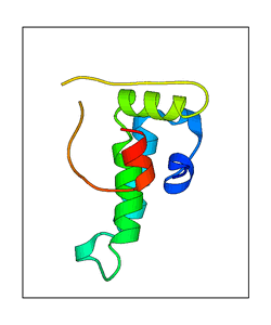 These views are prepared from three orthologuous viewpoints with MolScript. Secondary structures are determined from the C-alpha atom positions of your protein (N-terminal blue, C-terminal red).