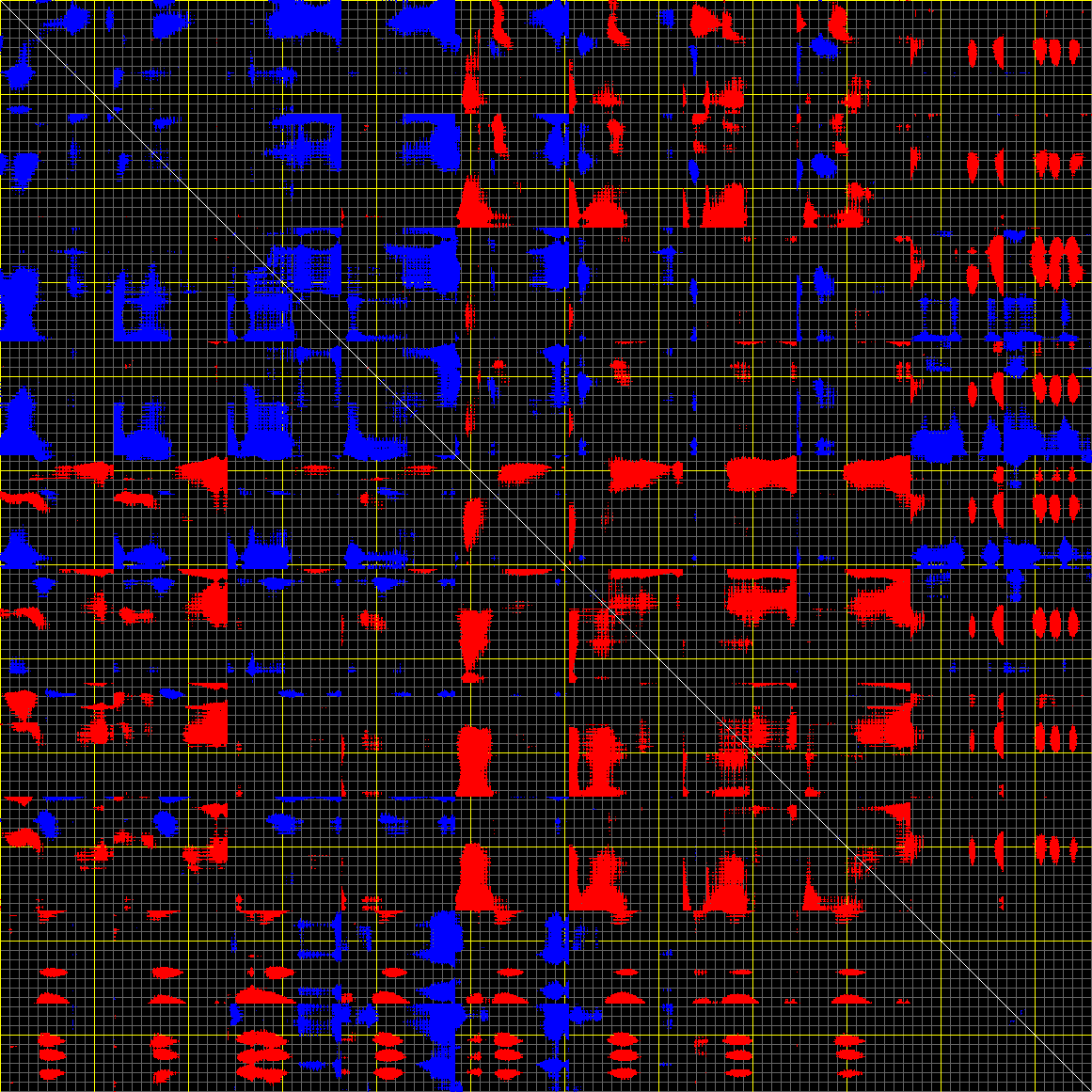 This matrix displays the maximum distance fluctuations between all pairs of CA atoms and between the two extreme conformations that were computed for this mode (DQMIN/DQMAX). Distance increases are plotted in blue and decreases in red for the strongest 10% of the residue pair distance changes. Every pixel corresponds to a single residue. Grey lines are drawn every 10 residues, yellow lines every 100 residues (counting from the upper left corner).