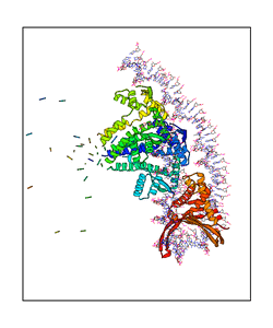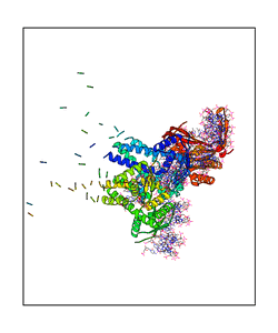 CAUTION: The amplitude range presented in these views corresponds to the highest (DQMAX) and lowest (DQMIN) perturbations chosen for this mode. Secondary structures can break down (and thus disappear from the animation) if the applied amplitudes are too large for Molscript to identify them. The choice of the amplitude is not a NMA result, but has to be done by the user on physical grounds. To change the amplitude range, you can recompute the animation of the desired mode by using the "Compute additional perturbed models with elNémo" section on the results page of your job.