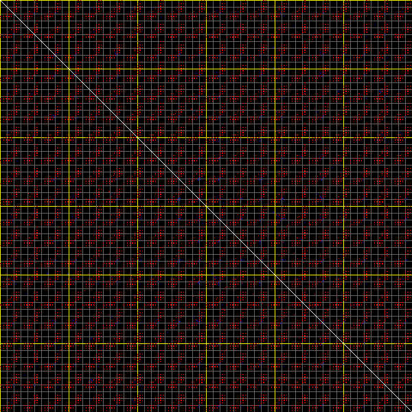 This matrix displays the maximum distance fluctuations between all pairs of CA atoms and between the two extreme conformations that were computed for this mode (DQMIN/DQMAX). Distance increases are plotted in blue and decreases in red for the strongest 10% of the residue pair distance changes. Every pixel corresponds to a single residue. Grey lines are drawn every 10 residues, yellow lines every 100 residues (counting from the upper left corner).