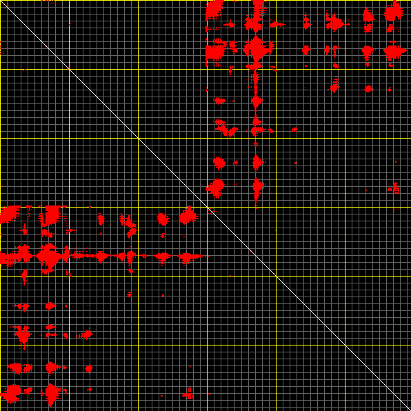This matrix displays the maximum distance fluctuations between all pairs of CA atoms and between the two extreme conformations that were computed for this mode (DQMIN/DQMAX). Distance increases are plotted in blue and decreases in red for the strongest 10% of the residue pair distance changes. Every pixel corresponds to a single residue. Grey lines are drawn every 10 residues, yellow lines every 100 residues (counting from the upper left corner).