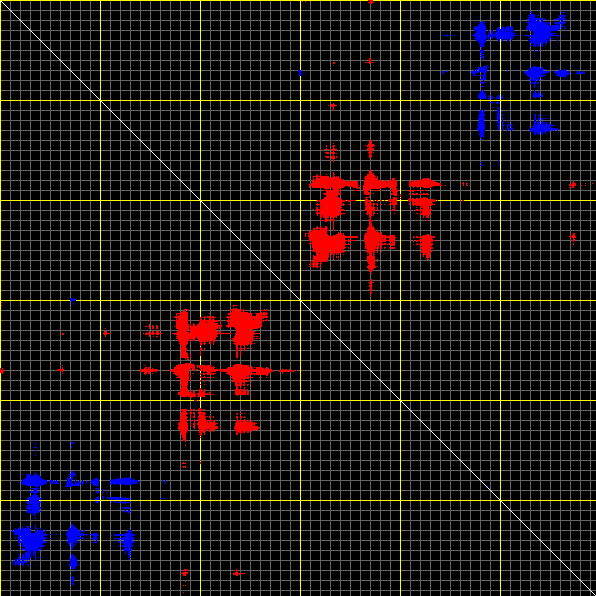 This matrix displays the maximum distance fluctuations between all pairs of CA atoms and between the two extreme conformations that were computed for this mode (DQMIN/DQMAX). Distance increases are plotted in blue and decreases in red for the strongest 10% of the residue pair distance changes. Every pixel corresponds to a single residue. Grey lines are drawn every 10 residues, yellow lines every 100 residues (counting from the upper left corner).