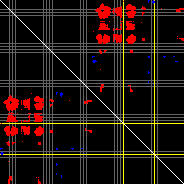 This matrix displays the maximum distance fluctuations between all pairs of CA atoms and between the two extreme conformations that were computed for this mode (DQMIN/DQMAX). Distance increases are plotted in blue and decreases in red for the strongest 10% of the residue pair distance changes. Every pixel corresponds to a single residue. Grey lines are drawn every 10 residues, yellow lines every 100 residues (counting from the upper left corner).
