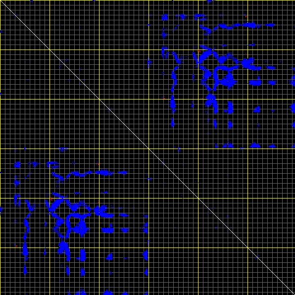 This matrix displays the maximum distance fluctuations between all pairs of CA atoms and between the two extreme conformations that were computed for this mode (DQMIN/DQMAX). Distance increases are plotted in blue and decreases in red for the strongest 10% of the residue pair distance changes. Every pixel corresponds to a single residue. Grey lines are drawn every 10 residues, yellow lines every 100 residues (counting from the upper left corner).