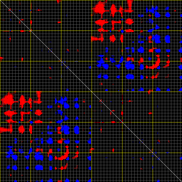 This matrix displays the maximum distance fluctuations between all pairs of CA atoms and between the two extreme conformations that were computed for this mode (DQMIN/DQMAX). Distance increases are plotted in blue and decreases in red for the strongest 10% of the residue pair distance changes. Every pixel corresponds to a single residue. Grey lines are drawn every 10 residues, yellow lines every 100 residues (counting from the upper left corner).