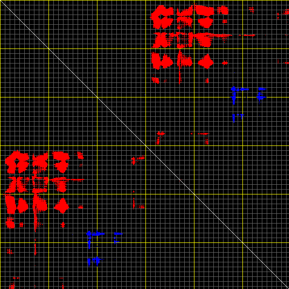 This matrix displays the maximum distance fluctuations between all pairs of CA atoms and between the two extreme conformations that were computed for this mode (DQMIN/DQMAX). Distance increases are plotted in blue and decreases in red for the strongest 10% of the residue pair distance changes. Every pixel corresponds to a single residue. Grey lines are drawn every 10 residues, yellow lines every 100 residues (counting from the upper left corner).