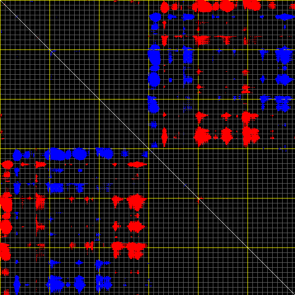 This matrix displays the maximum distance fluctuations between all pairs of CA atoms and between the two extreme conformations that were computed for this mode (DQMIN/DQMAX). Distance increases are plotted in blue and decreases in red for the strongest 10% of the residue pair distance changes. Every pixel corresponds to a single residue. Grey lines are drawn every 10 residues, yellow lines every 100 residues (counting from the upper left corner).