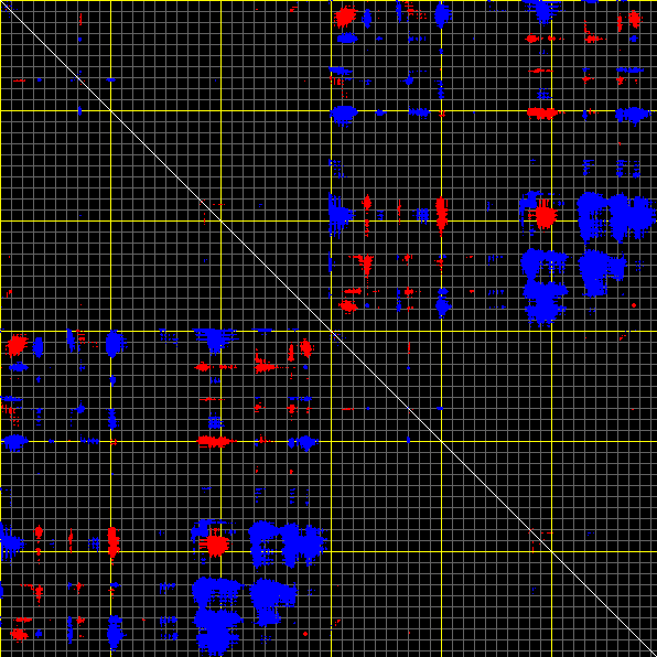 This matrix displays the maximum distance fluctuations between all pairs of CA atoms and between the two extreme conformations that were computed for this mode (DQMIN/DQMAX). Distance increases are plotted in blue and decreases in red for the strongest 10% of the residue pair distance changes. Every pixel corresponds to a single residue. Grey lines are drawn every 10 residues, yellow lines every 100 residues (counting from the upper left corner).