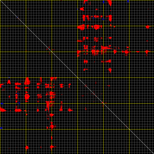 This matrix displays the maximum distance fluctuations between all pairs of CA atoms and between the two extreme conformations that were computed for this mode (DQMIN/DQMAX). Distance increases are plotted in blue and decreases in red for the strongest 10% of the residue pair distance changes. Every pixel corresponds to a single residue. Grey lines are drawn every 10 residues, yellow lines every 100 residues (counting from the upper left corner).