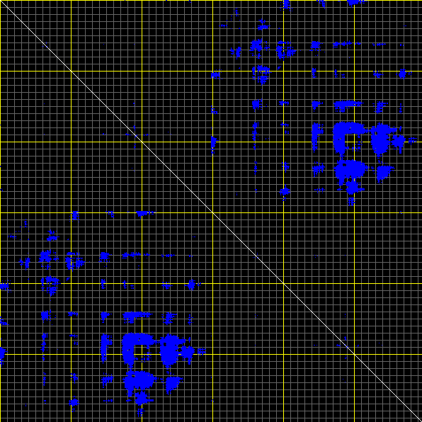 This matrix displays the maximum distance fluctuations between all pairs of CA atoms and between the two extreme conformations that were computed for this mode (DQMIN/DQMAX). Distance increases are plotted in blue and decreases in red for the strongest 10% of the residue pair distance changes. Every pixel corresponds to a single residue. Grey lines are drawn every 10 residues, yellow lines every 100 residues (counting from the upper left corner).