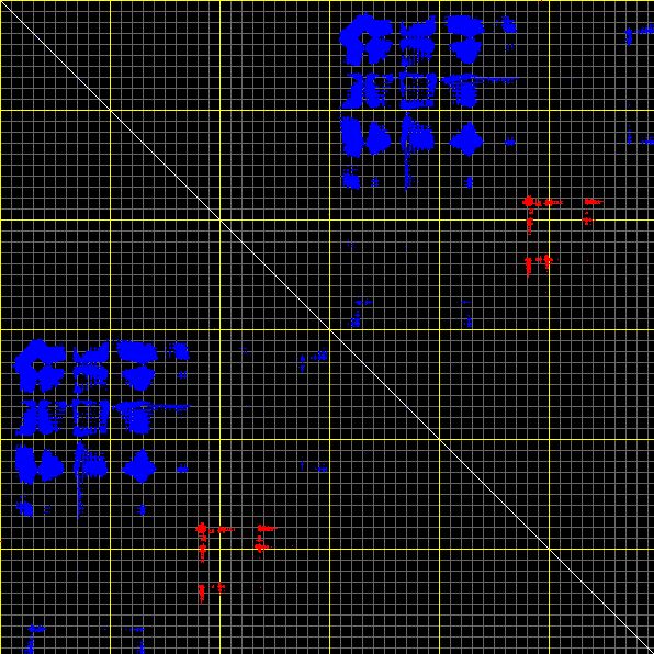 This matrix displays the maximum distance fluctuations between all pairs of CA atoms and between the two extreme conformations that were computed for this mode (DQMIN/DQMAX). Distance increases are plotted in blue and decreases in red for the strongest 10% of the residue pair distance changes. Every pixel corresponds to a single residue. Grey lines are drawn every 10 residues, yellow lines every 100 residues (counting from the upper left corner).