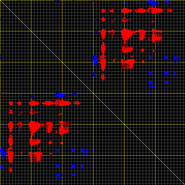 This matrix displays the maximum distance fluctuations between all pairs of CA atoms and between the two extreme conformations that were computed for this mode (DQMIN/DQMAX). Distance increases are plotted in blue and decreases in red for the strongest 10% of the residue pair distance changes. Every pixel corresponds to a single residue. Grey lines are drawn every 10 residues, yellow lines every 100 residues (counting from the upper left corner).