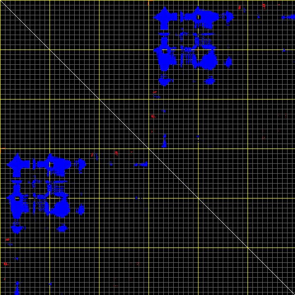 This matrix displays the maximum distance fluctuations between all pairs of CA atoms and between the two extreme conformations that were computed for this mode (DQMIN/DQMAX). Distance increases are plotted in blue and decreases in red for the strongest 10% of the residue pair distance changes. Every pixel corresponds to a single residue. Grey lines are drawn every 10 residues, yellow lines every 100 residues (counting from the upper left corner).