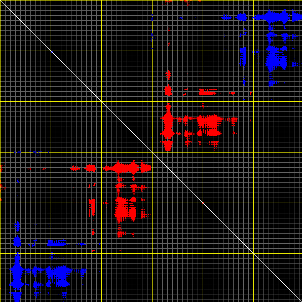 This matrix displays the maximum distance fluctuations between all pairs of CA atoms and between the two extreme conformations that were computed for this mode (DQMIN/DQMAX). Distance increases are plotted in blue and decreases in red for the strongest 10% of the residue pair distance changes. Every pixel corresponds to a single residue. Grey lines are drawn every 10 residues, yellow lines every 100 residues (counting from the upper left corner).