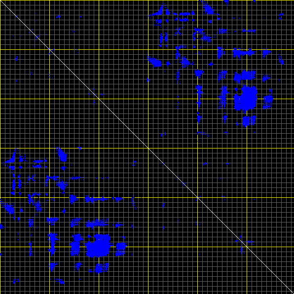This matrix displays the maximum distance fluctuations between all pairs of CA atoms and between the two extreme conformations that were computed for this mode (DQMIN/DQMAX). Distance increases are plotted in blue and decreases in red for the strongest 10% of the residue pair distance changes. Every pixel corresponds to a single residue. Grey lines are drawn every 10 residues, yellow lines every 100 residues (counting from the upper left corner).