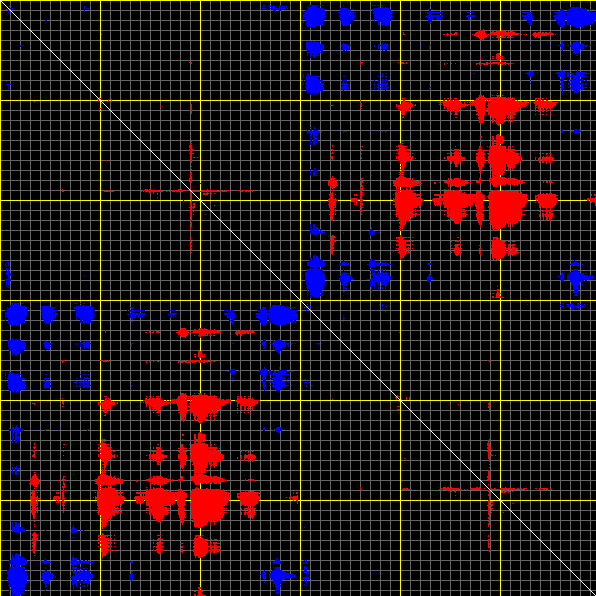 This matrix displays the maximum distance fluctuations between all pairs of CA atoms and between the two extreme conformations that were computed for this mode (DQMIN/DQMAX). Distance increases are plotted in blue and decreases in red for the strongest 10% of the residue pair distance changes. Every pixel corresponds to a single residue. Grey lines are drawn every 10 residues, yellow lines every 100 residues (counting from the upper left corner).
