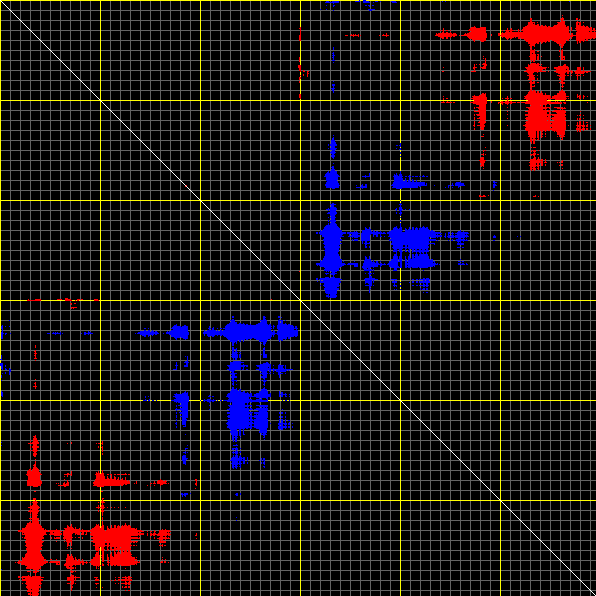 This matrix displays the maximum distance fluctuations between all pairs of CA atoms and between the two extreme conformations that were computed for this mode (DQMIN/DQMAX). Distance increases are plotted in blue and decreases in red for the strongest 10% of the residue pair distance changes. Every pixel corresponds to a single residue. Grey lines are drawn every 10 residues, yellow lines every 100 residues (counting from the upper left corner).