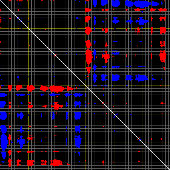 This matrix displays the maximum distance fluctuations between all pairs of CA atoms and between the two extreme conformations that were computed for this mode (DQMIN/DQMAX). Distance increases are plotted in blue and decreases in red for the strongest 10% of the residue pair distance changes. Every pixel corresponds to a single residue. Grey lines are drawn every 10 residues, yellow lines every 100 residues (counting from the upper left corner).