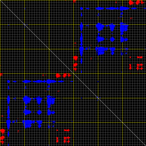 This matrix displays the maximum distance fluctuations between all pairs of CA atoms and between the two extreme conformations that were computed for this mode (DQMIN/DQMAX). Distance increases are plotted in blue and decreases in red for the strongest 10% of the residue pair distance changes. Every pixel corresponds to a single residue. Grey lines are drawn every 10 residues, yellow lines every 100 residues (counting from the upper left corner).