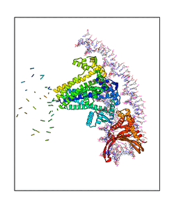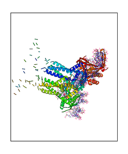 CAUTION: The amplitude range presented in these views corresponds to the highest (DQMAX) and lowest (DQMIN) perturbations chosen for this mode. Secondary structures can break down (and thus disappear from the animation) if the applied amplitudes are too large for Molscript to identify them. The choice of the amplitude is not a NMA result, but has to be done by the user on physical grounds. To change the amplitude range, you can recompute the animation of the desired mode by using the "Compute additional perturbed models with elNémo" section on the results page of your job.