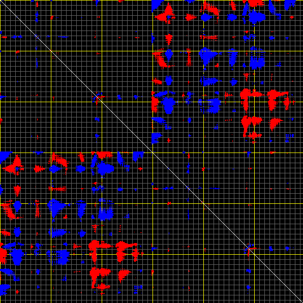 This matrix displays the maximum distance fluctuations between all pairs of CA atoms and between the two extreme conformations that were computed for this mode (DQMIN/DQMAX). Distance increases are plotted in blue and decreases in red for the strongest 10% of the residue pair distance changes. Every pixel corresponds to a single residue. Grey lines are drawn every 10 residues, yellow lines every 100 residues (counting from the upper left corner).