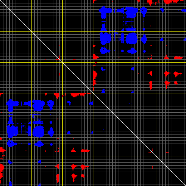 This matrix displays the maximum distance fluctuations between all pairs of CA atoms and between the two extreme conformations that were computed for this mode (DQMIN/DQMAX). Distance increases are plotted in blue and decreases in red for the strongest 10% of the residue pair distance changes. Every pixel corresponds to a single residue. Grey lines are drawn every 10 residues, yellow lines every 100 residues (counting from the upper left corner).