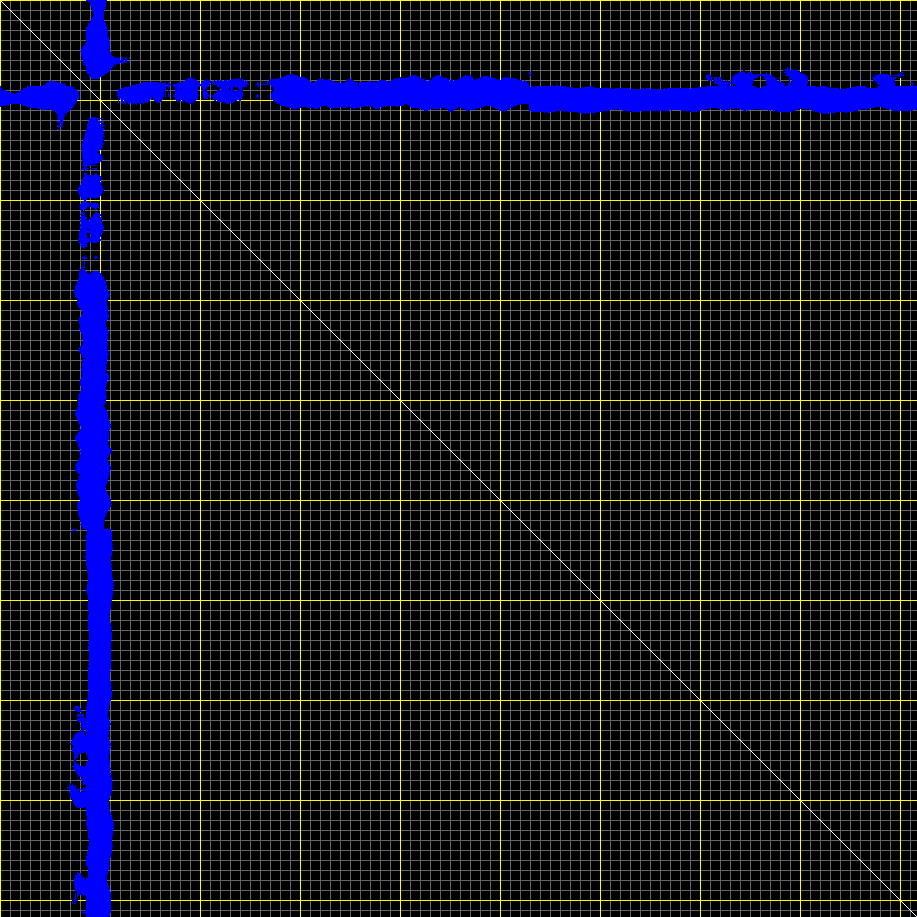 This matrix displays the maximum distance fluctuations between all pairs of CA atoms and between the two extreme conformations that were computed for this mode (DQMIN/DQMAX). Distance increases are plotted in blue and decreases in red for the strongest 10% of the residue pair distance changes. Every pixel corresponds to a single residue. Grey lines are drawn every 10 residues, yellow lines every 100 residues (counting from the upper left corner).