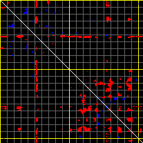 This matrix displays the maximum distance fluctuations between all pairs of CA atoms and between the two extreme conformations that were computed for this mode (DQMIN/DQMAX). Distance increases are plotted in blue and decreases in red for the strongest 10% of the residue pair distance changes. Every pixel corresponds to a single residue. Grey lines are drawn every 10 residues, yellow lines every 100 residues (counting from the upper left corner).