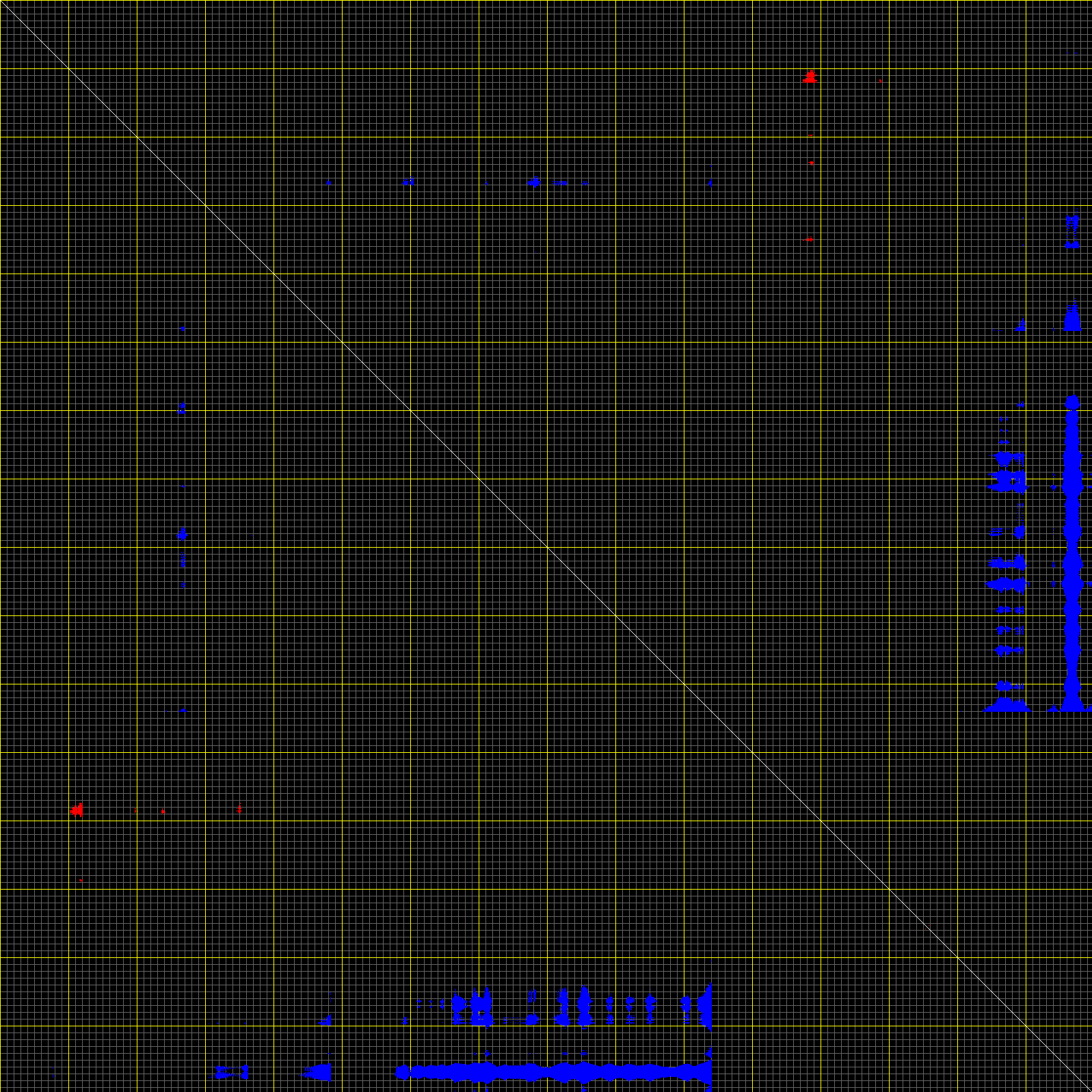 This matrix displays the maximum distance fluctuations between all pairs of CA atoms and between the two extreme conformations that were computed for this mode (DQMIN/DQMAX). Distance increases are plotted in blue and decreases in red for the strongest 10% of the residue pair distance changes. Every pixel corresponds to a single residue. Grey lines are drawn every 10 residues, yellow lines every 100 residues (counting from the upper left corner).