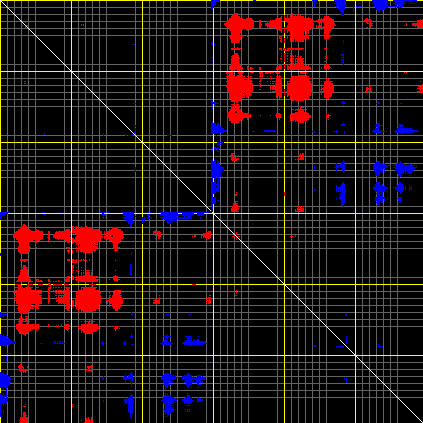 This matrix displays the maximum distance fluctuations between all pairs of CA atoms and between the two extreme conformations that were computed for this mode (DQMIN/DQMAX). Distance increases are plotted in blue and decreases in red for the strongest 10% of the residue pair distance changes. Every pixel corresponds to a single residue. Grey lines are drawn every 10 residues, yellow lines every 100 residues (counting from the upper left corner).