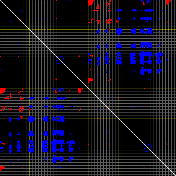 This matrix displays the maximum distance fluctuations between all pairs of CA atoms and between the two extreme conformations that were computed for this mode (DQMIN/DQMAX). Distance increases are plotted in blue and decreases in red for the strongest 10% of the residue pair distance changes. Every pixel corresponds to a single residue. Grey lines are drawn every 10 residues, yellow lines every 100 residues (counting from the upper left corner).