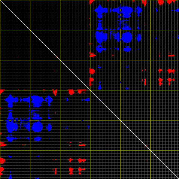 This matrix displays the maximum distance fluctuations between all pairs of CA atoms and between the two extreme conformations that were computed for this mode (DQMIN/DQMAX). Distance increases are plotted in blue and decreases in red for the strongest 10% of the residue pair distance changes. Every pixel corresponds to a single residue. Grey lines are drawn every 10 residues, yellow lines every 100 residues (counting from the upper left corner).
