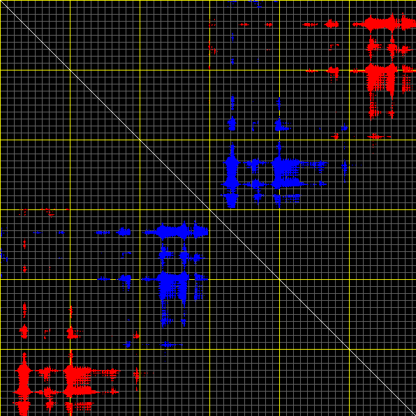 This matrix displays the maximum distance fluctuations between all pairs of CA atoms and between the two extreme conformations that were computed for this mode (DQMIN/DQMAX). Distance increases are plotted in blue and decreases in red for the strongest 10% of the residue pair distance changes. Every pixel corresponds to a single residue. Grey lines are drawn every 10 residues, yellow lines every 100 residues (counting from the upper left corner).