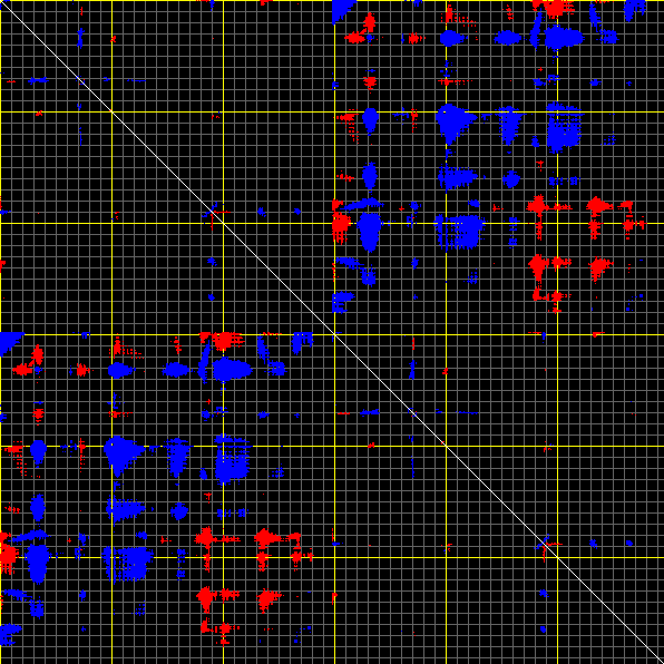 This matrix displays the maximum distance fluctuations between all pairs of CA atoms and between the two extreme conformations that were computed for this mode (DQMIN/DQMAX). Distance increases are plotted in blue and decreases in red for the strongest 10% of the residue pair distance changes. Every pixel corresponds to a single residue. Grey lines are drawn every 10 residues, yellow lines every 100 residues (counting from the upper left corner).